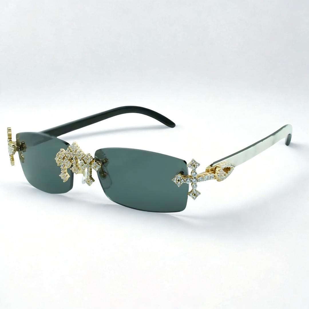 Featuring a black lens, these white buffs with iced out crosses are a bold, statement making pair of frames. These aren’t just glasses — they’re a lifestyle flex. The crisp white arms paired with a polished gold frame bring bold sophistication, while the CZ .50 pointer stones add that undeniable shine.