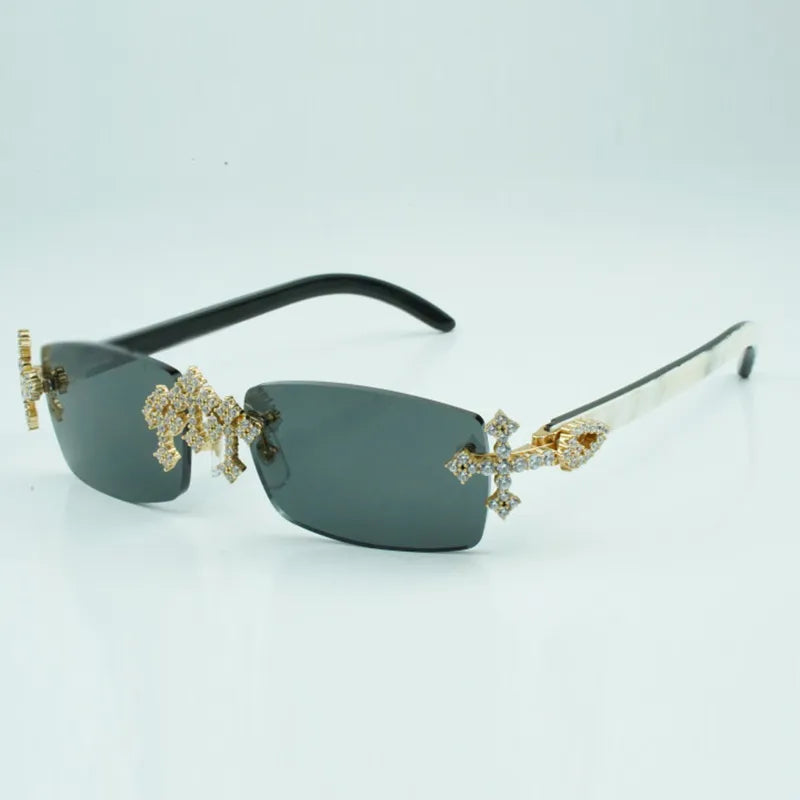 Featuring a black lens, these white buffs with iced out "chrome hearts" crosses are a bold, statement making pair of frames. These aren’t just glasses — they’re a lifestyle flex. The crisp white arms paired with a polished gold frame bring bold sophistication, while the CZ .50 pointer stones add that undeniable shine.