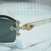 Featuring a red lens, these white buffs with iced out crosses are a bold, statement making pair of frames. These aren’t just glasses — they’re a lifestyle flex. The crisp white arms paired with a polished gold frame bring bold sophistication, while the CZ .50 pointer stones add that undeniable shine.