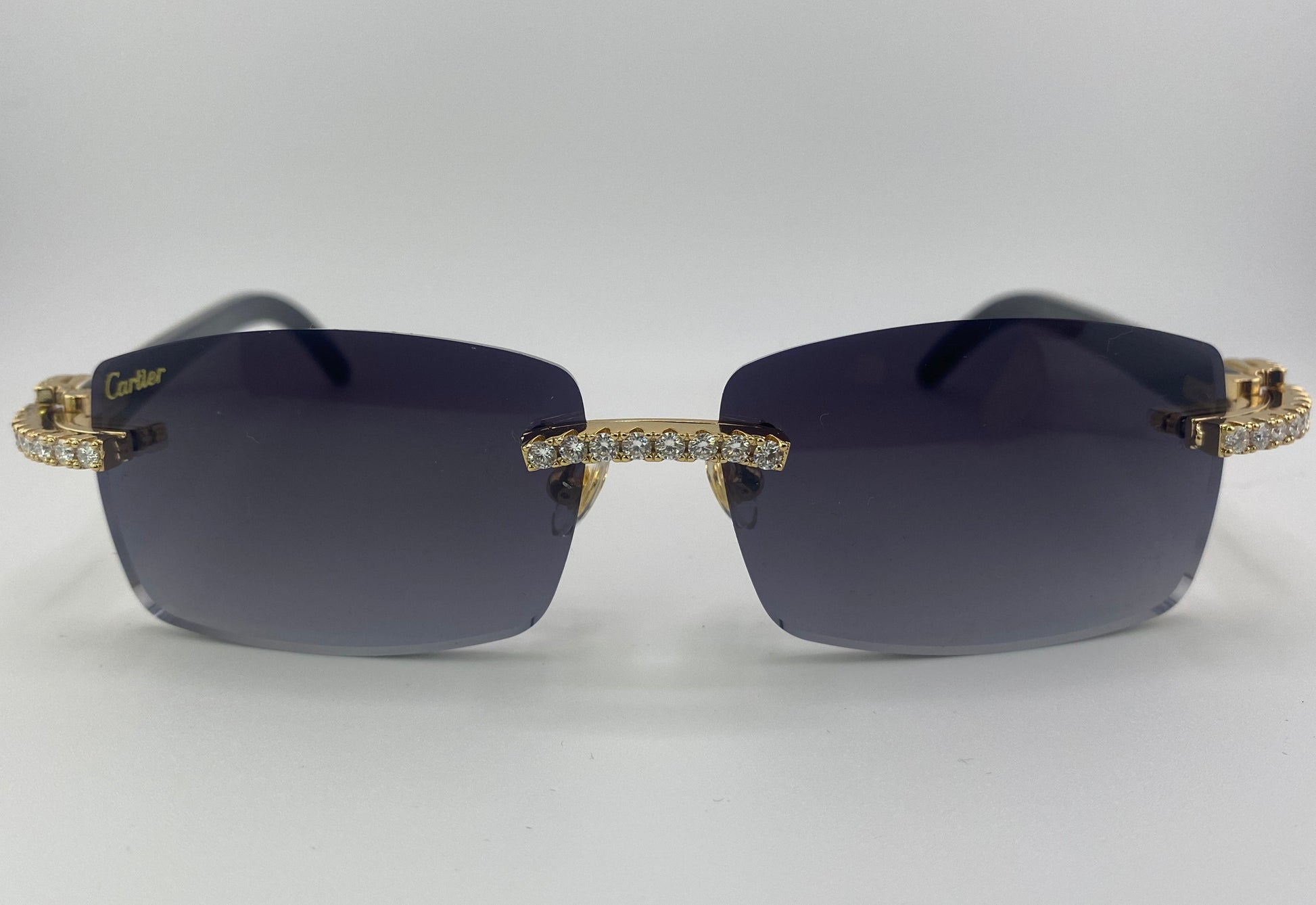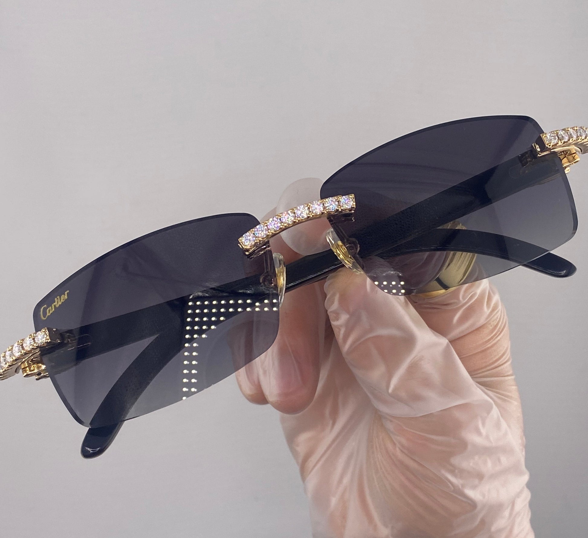 Turn heads and make a statement with our White Buffs Gold Frame Glasses featuring jet-black tinted lenses and sparkling iced out accents that bling and pass the diamond tester. These aren’t just glasses — they’re a lifestyle flex. The crisp white arms paired with a polished gold frame bring bold sophistication, while the GRA certified moissanite stones add that undeniable shine.